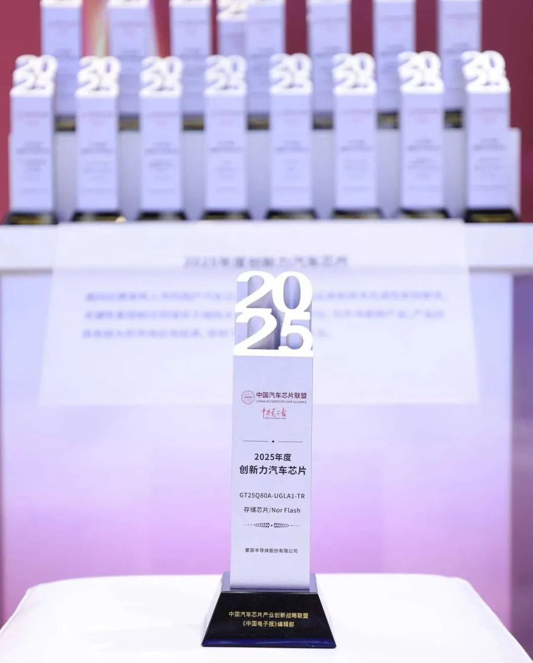 4 月 25 日,"2025 中国汽车芯片产业创新成果" 颁奖仪式在 2025 上海国际车展 "中国芯" 展区隆重举行。本次活动由中国汽车芯片产业创新战略联盟携手中国电子报共同主办,经过专家评委的评审与打分,亚星游戏官网半导体的车规A1等级NOR Flash芯片GT25Q80A-UGLA1-TR凭借卓越的技术领先性和市场应用表现,一举获得 2025 年度创新力汽车芯片。